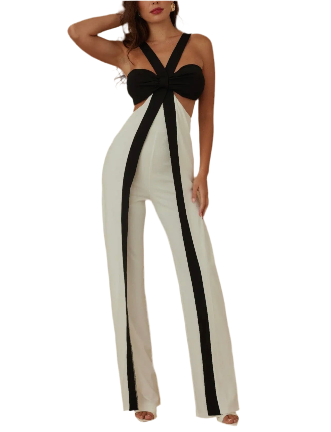 crisscross ribbon detail across the open front, this jumpsuit offers a daring silhouette with a sophisticated edge